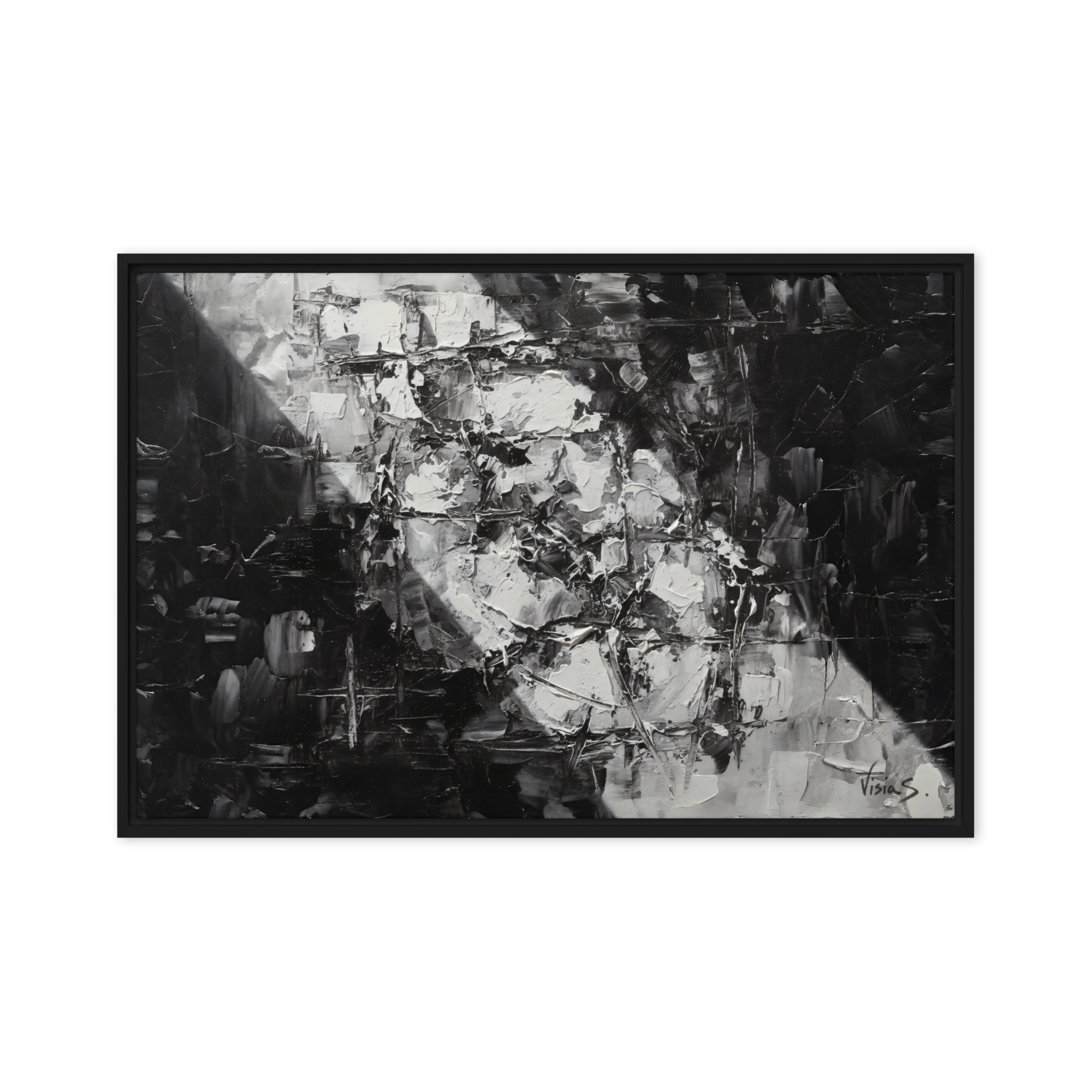 “Ash & Light” is a monochromatic masterpiece sculpted with heavy impasto, scraped surfaces, and dramatic chiaroscuro — pure charcoal, bone white, and smoky silver layered like time itself.
